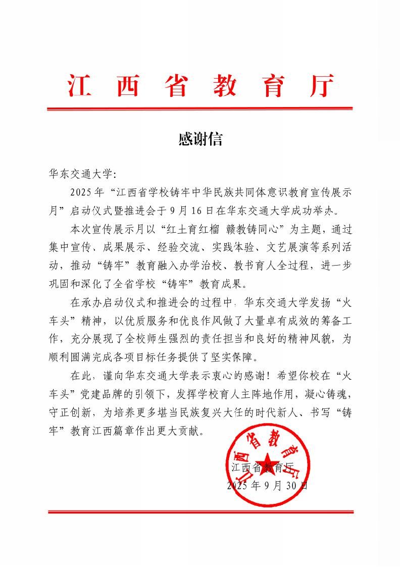 近日,江西省教育厅向我校发来感谢信,对我校在承办“江西省学校铸牢中华民族共同体意识教育宣传展示月”启动仪式暨推进会过程中的精心筹备和优质服务保障,表示衷心的感谢。